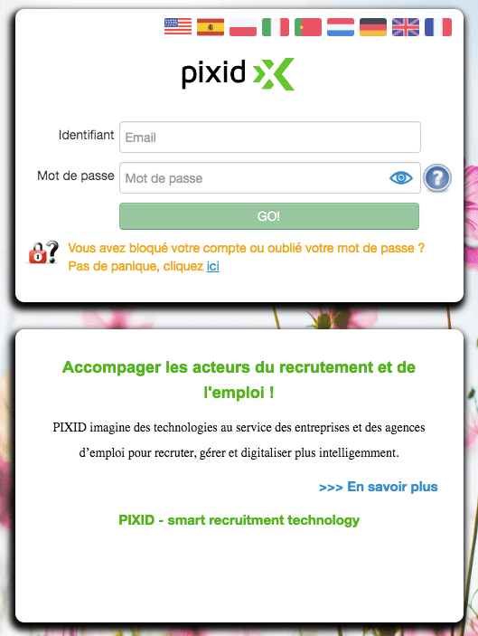 L’accès au compte personnel est conditionné par un mail envoyé par l’agence d’intérim. Une fois ce mail reçu, il faut y vérifier le lien d’accès à MyPixid, suivi d’un mot de passe temporaire. Une fois arrivé sur la page, le mot de passe et l’adresse email doivent y être saisis. Un SMS sera envoyé sur le numéro de téléphone que vous avez indiqué à l’agence. Dans ce SMS se trouve un code d’accès temporaire (il ne sera valable que 15 min), code qu’il faudra saisir pour valider l’activation du compte. Après avoir lu et confirmé les conditions d’utilisation de la plateforme, on vous demandera de définir votre nouveau mot de passe et de saisir le code reçu par SMS. Pour sécuriser votre compte, une question secrète, ainsi qu’un code PIN vous seront demandés. Ils clôturent les étapes de validation du compte MyPixid.